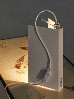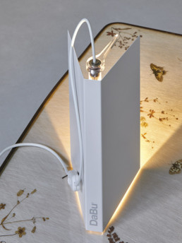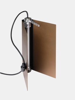 White and copper bronzetable lamp. The intense brightness that this lamp can offer is mechanically attenuable through the simple rotation of the dedicated lever: the light is kept inside this rigid and elegant cover, which integrates perfectly in any room of the house.